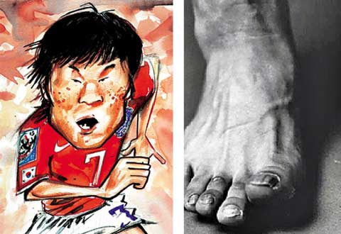 ▲(左)2002年韓日世界杯時尚顯稚嫩的樸智星,在2010年南非世界杯上成為主將,率領韓國足球前進。(右)樸智星的腳上長滿了老繭,還傷痕累累。圖片來自《朝鮮日報》
