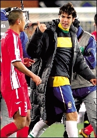 賽前大屏幕用視頻方式公布各隊首發名單,卡卡出現時,引發了全場最響亮掌聲和尖叫聲。當卡卡踏上球場,球迷的呼喊聲也是最大的。但比賽中的卡卡讓球迷失望了。卡卡每次拿球身邊總會有3名球員包夾。帶球被搶斷、傳球不到位、多次被撞翻,甚至帶球急停時摔跤。很顯然,卡卡的身體狀態非常糟糕。第80分鐘,卡卡被換下。賽后,心煩的卡卡甚至拒絕了鄭大世交換球衣的要求。