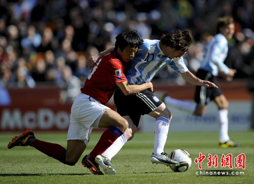 中新網6月17日電 北京時間今晚19點30分,2010年南非世界杯B組第二輪的首場比賽打響,由兩屆世界杯冠軍得主阿根廷隊迎戰亞洲“太極虎”韓國隊。16分鐘韓國隊前鋒樸周永不慎打入本屆世界杯的第二記烏龍;33分鐘阿根廷再獲得定位球,伊瓜因門前頭槌建功,2-0;上半場補時階段韓國隊由李青龍扳回1球,但下半場伊瓜因連入2球,上演本屆世界杯的第一個帽子戲法,助阿根廷4-1鎖定勝局,提前小組出線。