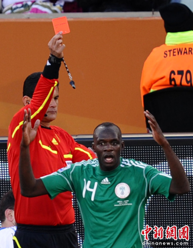 開場后雙方都比較謹慎,比賽略顯沉悶。上半時進行到第16分鐘尼日利亞率先打破僵局,希臘后衛帕帕斯塔多普洛斯拉倒尼日利亞奧代姆溫吉,裁判判罰任意球并掏出黃牌。尼日利亞12號前鋒烏切任意球直接射門破門,這也是本屆世界杯賽場上第一個任意球直接破門。