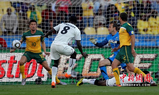 此后,場上多一人的加納隊大舉進攻,但是他們的水平過于粗糙,雖然對著澳大利亞隊的球門狂轟濫炸,但是卻是不著邊際。本場比賽,他們22腳射門,竟然只有6腳射進球門范圍之內,而且多數也不構成實質性威脅。倒是澳大利亞隊全場8腳射門5中門框范圍,除了上半場的進球,下半場有兩次幾乎攻破加納隊大門,完成絕殺。