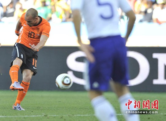 在經歷了多半場比賽的僵持后,第53分鐘,“橙衣軍團”終于撕開對手防線,范佩西回做,斯內德禁區外沒有停球直接大力遠射,日本門將川島永嗣奮力撲救,足球碰到他的左臂彈進網窩,1比0,荷蘭隊取得勝利。