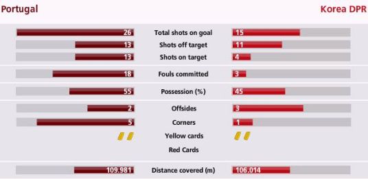 控球方面,葡萄牙隊(duì)占全場(chǎng)的55%,高于朝鮮隊(duì)的45%。角球方面也是葡萄牙占優(yōu),以5:1領(lǐng)先對(duì)手。在個(gè)人的速度方面,朝鮮隊(duì)也有多名球員高于葡萄牙隊(duì)球員,但是卻未能很好的把握,沒(méi)攻破對(duì)方的球門,讓人扼腕。