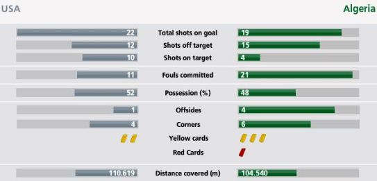 控球時間方面,美國隊52%領先于阿爾及利亞隊的48%。此外,美國隊獲得了4個角球,少于阿爾及利亞的5個。