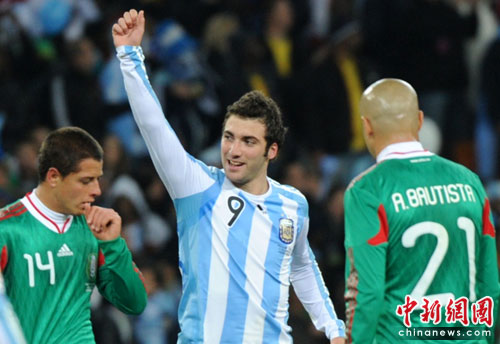 中新網6月28日電 今天凌晨2:30,南非世界杯1/8決賽再賽一場,阿根廷隊在約翰內斯堡的足球城球場迎來了墨西哥隊。憑借特維斯一個明顯越位進球首開紀錄,隨后伊瓜因和特維斯各進一球,以3-1擊敗墨西哥,晉級八強。