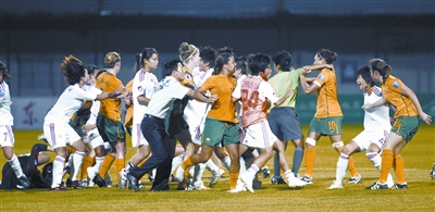 1:2落后,澳大利亞姑娘們似乎眼睛都紅了!兇猛得近乎男足的飛鏟在最后的時刻頻頻上演,無論是中國隊還是澳大利亞隊都在咬著牙堅持著。傷停補時的到來使得這場較量進入白熱化,門將張越的一次受傷倒地成為導火索,澳大利亞隊認為中國隊是在故意拖延時間,兩隊頓起糾紛,雙方替補席上的非比賽人員均沖入場內,一陣混亂過后,一名中國隊教練和澳大利亞隊后衛都被出示黃牌,如此激烈的判罰引起了澳大利亞球員的普遍不滿……