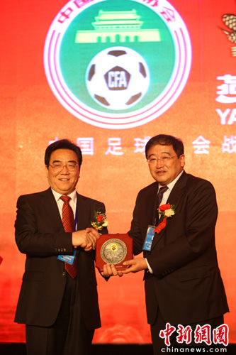 中國足球運動管理中心主任韋迪為燕京啤酒集團董事長李福成頒發獎牌。