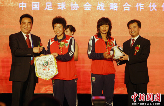 中國女足隊長為燕京啤酒集團董事長李福成贈送簽名足球、隊旗等。