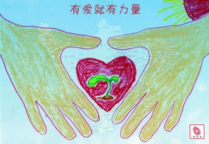 上周日,隊醫克蘭頓打電話告訴姚明傷情時,后者正在忙著作畫。缺席季后賽的消息并沒有影響到姚明的畫作。在這幅題為“有愛就有力量”的蠟筆畫中,兩只大手呵護著一顆紅色的愛心,里面有新芽生出。