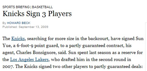 中新網9月14日電 北京時間昨日晚,《紐約時報》曝料稱:孫悅的經紀人查爾斯·包辛諾透露,尼克斯已經同中國球員孫悅簽訂了一份部分保障合同,補強球隊后場。