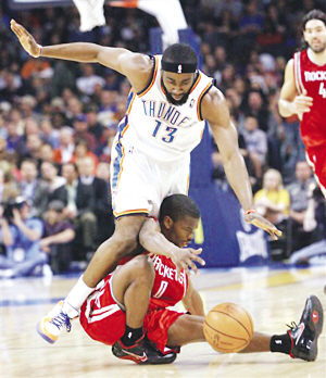 在剛剛加盟火箭隊的06-07賽季,“暴力扣將”斯威夫特有一天在家里休息,飛來一只蒼蠅飛到他的眼睛上,他用粗大的手指去揉眼睛,結果給揉出了結膜炎被迫缺席了9場比賽,據說用手指揉眼睛發生結膜炎的概率是百萬分之一。