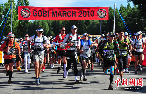 中新網烏魯木齊6月27日電(記者 汪金生)第六屆國際戈壁拉力賽(又名“戈壁長征”Gobi March)27日在新疆吐鄯善地區境內舉辦,來自美國、澳大利亞、法國、新西蘭、中國香港等34個國家和地區的154名選手、15名志愿者,將利用一周左右的時間,徒步走完280公里的征程。
