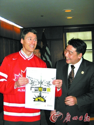 本報(bào)溫哥華2月11日電 (特派記者 張順亭) 溫哥華當(dāng)?shù)貢r(shí)間2月11日下午,廣州市副市長(zhǎng)、廣州亞組委常務(wù)副秘書(shū)長(zhǎng)許瑞生一行在溫哥華市政廳拜會(huì)了溫哥華市市長(zhǎng)羅品信。在中國(guó)的虎年春節(jié)即將來(lái)臨之際,許瑞生特意將一本以虎為題材的書(shū)贈(zèng)送給羅品信,祝他虎年虎虎生威。羅品信在一幅印有“廣州我撐你”字樣的畫(huà)上簽下自己的名字,并在一片“支持廣州”聲中表達(dá)了對(duì)廣州亞運(yùn)會(huì)的祝福。廣州體育局局長(zhǎng)劉江南、廣州亞組委市場(chǎng)開(kāi)發(fā)部部長(zhǎng)方達(dá)兒隨同會(huì)見(jiàn)。