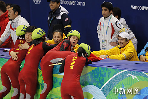 在裁判宣布韓國隊犯規后,一直等候著最終結果的中國姑娘忘情地撲向教練席。圖片清楚地顯示,興奮的王濛撲到教練李琰前面寬寬的防護墊上,她的右腿無意間高高抬起,冰刀刮到了跟在她身后的張會的下巴。王濛意識到自己闖了禍,馬上關切地回頭察看張會的傷情。四位姑娘舉著國旗慶祝勝利時,張會用手捂著她的下巴,漸漸地鮮血浸濕了她的手套。