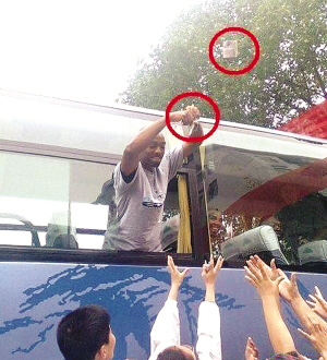 5月23日晚上,湖南湘西某地有關方面邀請美國體育使者男子明星籃球隊與立陶宛蘇托瓦職業男子籃球隊在該地體育館舉行對抗賽。賽前,兩支球隊分別到當地的一些中學進行訪問,然而,在5月22日美國體育使者男子明星籃球隊到市第一中學訪問時出現讓人憤怒的一幕,一美國球員在車輛離開校園時打開窗戶,向圍觀的中學生撒人民幣,造成現場一度失控。