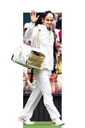 盡管溫網的死規定讓選手服裝成了一片單調的白色,但“大腕”的服裝贊助商們仍能想方設法地在服裝款式和修飾上別出心裁,費德勒把白色秀出了“軍裝”的感覺。費德勒走上中心球場時,穿著件特別設計的純白外套,金色的邊紋,小立領,四個方正的大口袋——袖子上還有一個小口袋,頗有軍旅風情。左側胸前印有交織在一起的RF兩個金色字母,是費德勒姓名的縮寫。加上外套下的那件復古的西裝背心,還有同樣金、白兩色,同樣有RF字樣的比賽用包,“費天王”的“服裝秀”的比賽本身更加讓人津津樂道。