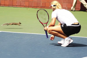 小松鼠闖美網場地逗樂大腕 纏斗網球憨態可掬(圖)