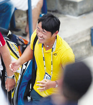 兩盤比賽,李娜沒有給對手任何機會,丈夫姜山在場下的表情逐漸變得豐富起來,不再是往常那樣的面無表情或者是淺淺的微笑,從他的臉上能看出明顯的情緒變化,滿臉的笑容能夠讓所有人感受到他的興奮。第二盤在自己的發球局里,李娜連得三分拿到三個賽點,并且在第一個賽點出現時就拿下比賽。李娜在賽場內蹦了起來,姜山和托馬斯在場外也是一陣狂喜,姜山的眼睛瞇成了一條縫,嘴也快咧到耳根。跟往常一樣,姜山和托馬斯在比賽結束之后就背著球包離開。他和托馬斯一邊走一邊聊天,不斷有球迷從他們倆中間穿過,這絲毫沒有影響兩人的好心情,他們很興奮地一邊聊天一邊比劃著。姜山伸出食指指向天空,難道是已經將目標瞄準了第一嗎?