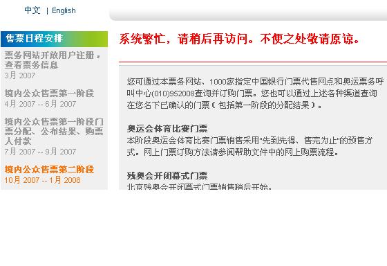 與第一階段抽簽決定門票獲得者不同,此次發售實行“先到先得,售完為止”的銷售政策。所以9點鐘剛過,記者就嘗試打訂票熱線,不過30分鐘后,記者還是沒有打通。記者隨后嘗試訪問北京奧運會官方票務網站,該網站顯示“系統繁忙,請稍后再訪問。不便之處敬請原諒。”后來讓其他朋友訪問,則干脆訪問不了頁面。