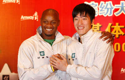 作為安利紐崔萊的代言人,劉翔和鮑威爾曾經一同出現在廣告里,但當時劉翔和鮑威爾都在不同的地方進行拍攝,廣告是經過后期特效組合而成的。此番兩個人一同出現在上海,也參與了安利新廣告的拍攝,“和鮑威爾的合作很有意思,導演要求我們完成一個熱情的擁抱,有那種惺惺相惜的感覺,但很難,我們總是笑場。”劉翔與鮑威爾的友情盡在不言中,不過真要把這一切演繹出來,兩個業余演員就不那么自在了。