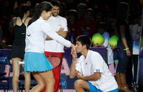 5歲的時候就認識,并且開始一起學習網球,德約科維奇和伊萬諾維奇可謂是青梅竹馬、兩小無猜,感情自然不是一般的深厚。眼見著如今20歲的小伊日漸出落成了一個大美女,小德也頗有些耐不住寂寞,就在澳網前夕,在家鄉貝爾格萊德的一場表演賽上,德約科維奇還當眾上演了“求婚秀”——在伊萬諾維奇面前單膝跪地,并且用哀求的眼光看著對方,最后還深情地吻了阿娜的手背,讓小美女“嚇”得不輕。