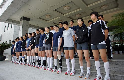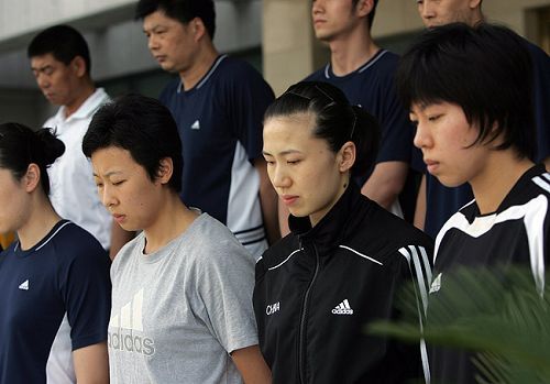 下午14時(shí)許,全隊(duì)一反平日午休的習(xí)慣,匯集在基地體育賓館大堂,姑娘們都刻意回避穿著那套紅色的運(yùn)動(dòng)服。14時(shí)25分,全體教練員、運(yùn)動(dòng)員在國家排球運(yùn)動(dòng)管理中心徐利主任的帶領(lǐng)下,在賓館外整齊列隊(duì),徐利主任說:“根據(jù)國務(wù)院公告,為表達(dá)全國各族人民對(duì)四川汶川大地震遇難同胞的深切哀悼,中國女排隊(duì)為遇難者默哀。”14時(shí)28分寧波北侖空襲警報(bào)聲劃破長(zhǎng)空,體育賓館外的馬路上,汽車笛聲四起,女排姑娘們神色凝重,低頭為7天前的這個(gè)時(shí)刻遭受地震劫難的人們默哀。