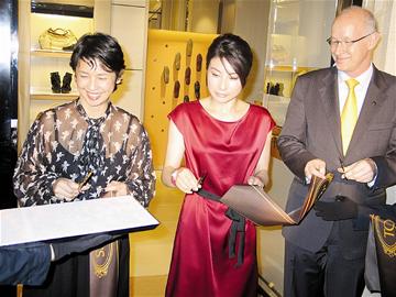 剪彩完畢,在主人的引導下,郭晶晶參觀了這家商店。在一款女式皮包前,TOD’S亞太區主席對她說:“這與你那個國旗包包是同一款。”