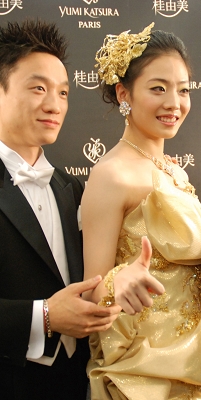 這件由桂由美打造的價值3000萬元的黃金婚紗,是婚紗界的頂級藝術品。全世界僅有兩件,另外一件已經被日本國立博物館收藏。完成造型,穿上婚紗,當兩人手挽手出現在大堂時,無數閃光燈頓時閃起。此時的楊威有些緊張,抿著嘴擠出一絲笑容,倒是楊云顯得自然很多,一手拿著紅色禮花,大方地向鏡頭露出迷人的微笑。過了10分鐘,楊威才從緊張的情緒中舒緩過來,左手搭在楊云的肩上,兩人一起擺著POSE。