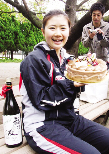 面對(duì)眾人送上的蛋糕,福原愛(ài)高興地接受了,但對(duì)來(lái)賓們“整蠱”似地送上的日本清酒,單純可愛(ài)的福原愛(ài)并不為所動(dòng),“雖然我出生在釀酒世家,但從小就對(duì)含有酒精的清酒味道相當(dāng)?shù)钟|。盡管作為一名成年人可以喝酒了,但我卻依然會(huì)堅(jiān)持滴酒不沾的原則,包括抽煙也一樣,絕對(duì)不會(huì)去碰。”福原愛(ài)的祖輩都是釀酒的行家里手,據(jù)說(shuō)她的父親福原武彥更是酒量驚人。