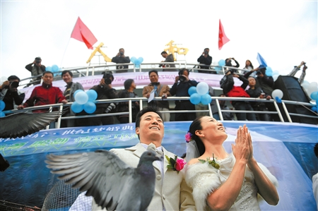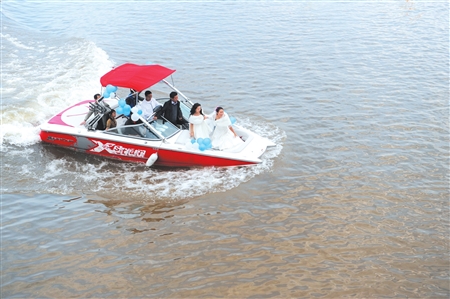 隨后,新郎牽著新娘的手,雙雙登上游艇。新郎正是四川激流回旋隊教練陳勇,新娘則是奧運帆板冠軍殷劍。昨日,這對幸福的新人,在現(xiàn)場近千人的祝福聲中步入了婚姻的殿堂。自此,享譽世界的帆板奧運冠軍也有了自己幸福的港灣。