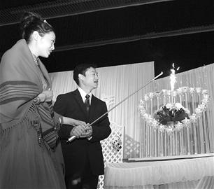 昨日中午楊威攜愛妻楊云回到仙桃答謝父老鄉親,宴會儀式喜慶而簡單。儀式中最引人注目的是,楊威楊云從雙方的母親手中接過火種,一起點亮愛的火焰。