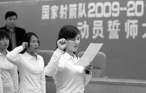 昨天下午,新一屆中國射箭隊在廣州黃村基地進行了動員大會。在射運中心主任高志丹,副主任王義夫和總教練田渝陵的帶領下,北京奧運射箭金牌得主張娟娟代表運動員宣讀誓詞,射箭隊全隊面對國旗誓師。