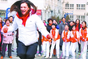 昨天,曾26次打破世界紀錄的俄羅斯撐桿跳運動員伊辛巴耶娃應邀來到史家胡同小學分校,指導學生們撐桿跳的基本技能,并饒有興致地學起跳繩、抖空竹、滾鐵環等趣味體育活動。
