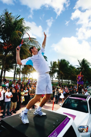 邁阿密當(dāng)?shù)貢r(shí)間3月23日,為了宣傳索愛公開賽,大威和穆雷分別站到一輛車上,打起了“車上網(wǎng)球”。