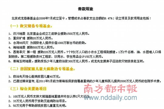 北京成龍慈善基金會成立于四川地震后2008年7月,旨在幫助捐款人成龍及其他所有捐款好友并監管各類善款。這次捐款風波的發生,北京成龍慈善基金會成為關注焦點,善款去向也成為許多人期望了解的內容。昨天,該基金會官網上“善款用途”欄目中,一筆歸為救災儲備專項基金的“汶川地震北京基金會成立之前聯合援助1500萬元人民幣”引起人們關注,有媒體對比先前公開資料,發現2008年5月13日成龍與楊受成曾以成龍、楊受成基金的名義聯合捐助了1000萬,而另外的500萬捐助卻無跡可尋,在官網上也并無清晰的說明。因此有關500萬的下落追蹤又引出了新的爭議,對此黨群向南都記者解釋道,這筆500萬元屬于聯合捐助款項,“這些錢都是在基金會成立之前(捐獻)的,所以沒有走基金會(這邊的程序)。之前媒體報道的是那一大筆錢(指成龍、楊受成聯合捐助的1000萬),那一小筆(指500萬)沒有報道過,這筆錢采用的方式用途等統統也沒有對外透露,當時是計劃等(項目)全部確實做成了才宣布。”
