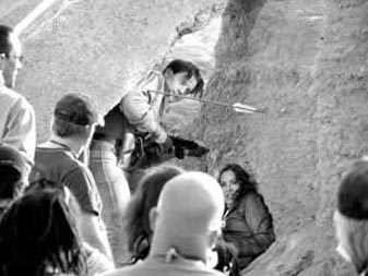 昨日(18日)拍攝的這場戲講的是布蘭登·弗雷澤與瑪麗亞·貝羅遭到敵人的追殺,二人在沙漠中一邊躲避弓箭的襲擊,一邊還擊,雕翎箭與短槍的交火頗有些“關公戰秦瓊”的味道。布蘭登扮演的里克一身牛仔裝扮,手拿一把短槍,依舊延續了前兩集中的扮相,而瑪麗亞扮演的艾芙琳則穿著深棕色短款夾克,足蹬馬靴,手持一把手槍。導演羅伯·科恩一聲“開始”后,他們在巖石后緊張地躲避著敵人的追趕,此時,一支雕翎箭射來,擦著布蘭登的右臂射進土墻,布蘭登立即伏地掩護瑪麗亞,并迅速用槍還擊,而瑪麗亞也起身與他并肩作戰。盡管這個鏡頭在片中只出現短短的10秒鐘,但科恩導演還是讓兩位主演拍了3遍。