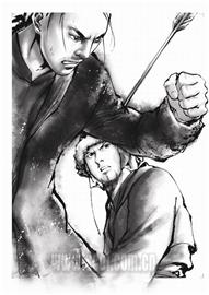 “電腦技術能很好地解決毛筆技法較難處理的地方”,光祖說,“而且電腦上色快,易修改,效率高 ,有問題可以馬上解決,便利性強。在決定用水墨技法以后,我們用了較長的一段時間去用電腦體現毛筆的感覺,剛開始的時候還遇到不少困難,還好到最后還是解決了。”他說:“所有的連載都是用毛筆作底稿,后期再用電腦去潤色,增強國畫效果。在創作初期,毛筆的底稿是必要的,漫畫所有的基調還是要一筆一劃畫出來,而后期的潤色,則用電腦,這樣互相配合,才能充分發揮兩者的優點嘛。”