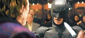 對于希斯·萊杰的加盟,外界普遍認為他比前任小丑的扮演者杰克·尼科爾森更具看頭。果然首段預告片中他的表現就令人十分驚艷。故事講述葛咸城出現一位自稱小丑的瘋狂罪犯,利用大殺傷力武器搶劫銀行,令警方束手無策,驚動蝙蝠俠出手相助,最后被捕入獄。出獄后的小丑公然向蝙蝠俠挑戰,片中有不少兩人街頭對決和他亂槍掃射的場面,正邪之戰最終演變成私人恩怨。而扮演小丑的希斯·萊杰無論舉手投足,甚至說話聲線均邪氣十足,配上其恐怖化妝及歇斯底里的笑聲,實在叫人不寒而栗。片中小丑一句口頭禪“Why So Serious?”(何需如此認真?),更成為了新一批電影海報的標語。