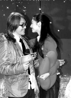 最后,兩個小演員徐嬌和黃蕾深深獻吻,周星馳高興地半跪在地“接受禮物”,卻因為臺下的攝影記者找不到角度而“下跪受吻”好幾次。