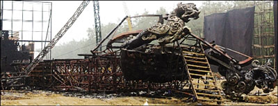 昨天中午,記者趕到現場時,劇組工作人員在事發地數百米周圍都拉起白線,禁止人員隨意進入現場。被燒仿古戰船停在科技園東北角處,停放在劇組場地中間位置平地上,長約20米,整個船身被燒得只剩一個骨架,另一艘小戰船船頭也發生破損,場地四周一面帷幕墻被燒毀。