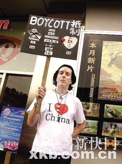 一位網(wǎng)友在他的博客中介紹了事情的經(jīng)過(guò):“在北大教書(shū)的美國(guó)人Tim Lies和他的中文翻譯日前來(lái)到位于北京北三環(huán)的華星國(guó)際影城,手舉著一個(gè)寫(xiě)著‘BOY-COTT 抵制’的牌子開(kāi)始了他抵制好萊塢電影《功夫熊貓》的實(shí)際行動(dòng)。他希望中國(guó)電影不要變成第二個(gè)好萊塢。”