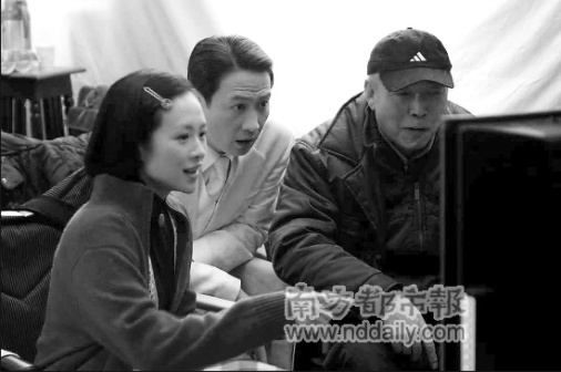 陳凱歌與章子怡、黎明在《梅蘭芳》拍攝現場。