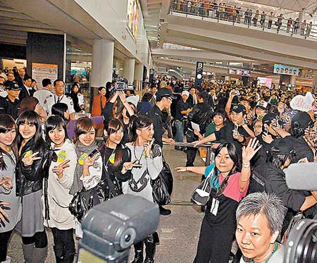 保安員筑起人鏈阻擋fans,讓黑澀會美眉(左)站定拍照。