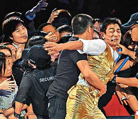 中新網12月25日電 劉德華前晚在紅館演出第三場演唱會,繼續以好歌會知音,但出現輕微聲沙情況,他見臺下歌迷都熱情狂叫,擔心大家會一齊失聲。有歌迷親近偶像心切,差點把華仔拉下臺,幸好保安人員上前解圍。