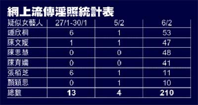 發放者先于昨日凌晨約1時30分傳出一張疑似顏穎思的淫照,直至昨午1時半,共210張淫照以zipfile(壓縮檔)形式經電郵傳出,其中疑似鍾欣桐的照片最多,達53張(見表)。前晚開始更陸續有網友聲稱看過一段約32分鐘有關陳冠希與一名女藝人的短片。