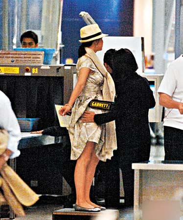劉嘉玲和梁朝偉昨日凌晨由曼谷機場轉飛不丹,臨上機前二人如普通旅客一般,要經過金屬探測機測試,未料嘉玲過關時竟發出BB聲響,女關員即上前一手拿 金屬探測儀器,一手摸嘉玲腰胸搜身,而嘉玲非常合作,自動脫掉帽子,挺直腰板任由女關員檢查,最后安然過關開心上機。