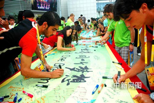 “同一個世界,同一個夢想”營員們在長卷上簽字留念。