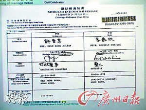 許晉亨與李嘉欣的結(jié)婚登記表。