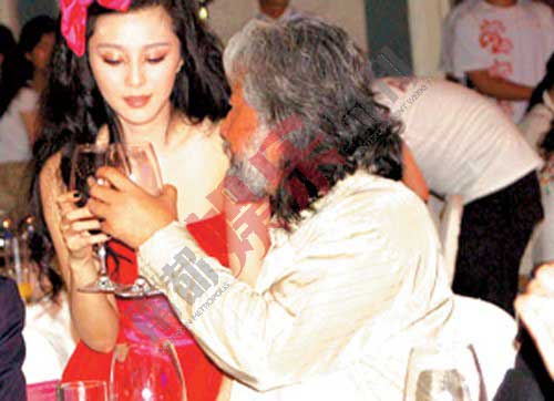 2006年,范冰冰身穿芭比娃娃裝,坐在張紀中大腿上。