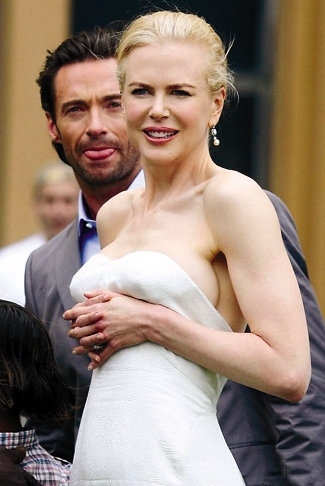 也許是太過放松,妮可·基德曼在向影迷們揮手致意的時(shí)候,身上穿的白色露肩晚禮服竟然悄然下滑,令其胸部走光,她驚覺后趕緊雙手護(hù)胸。